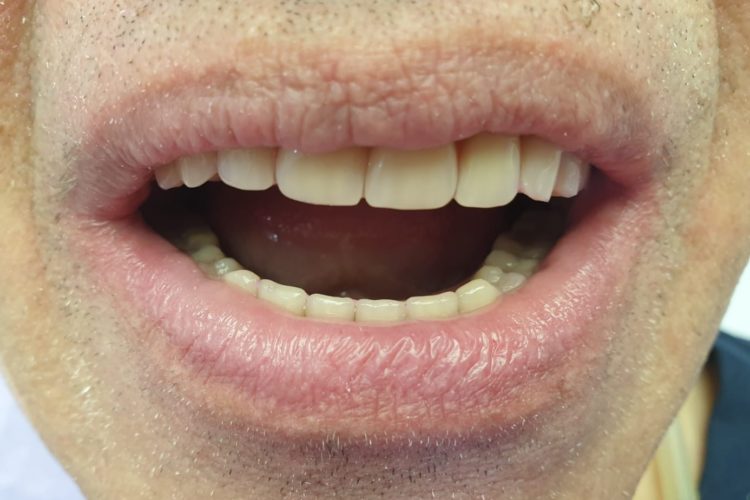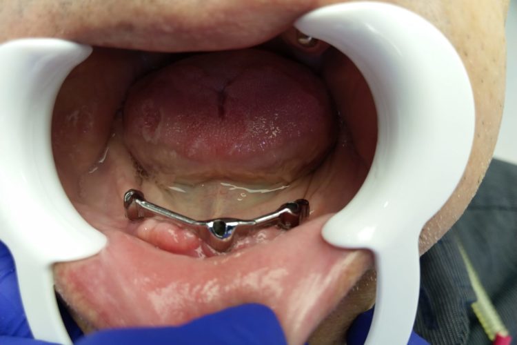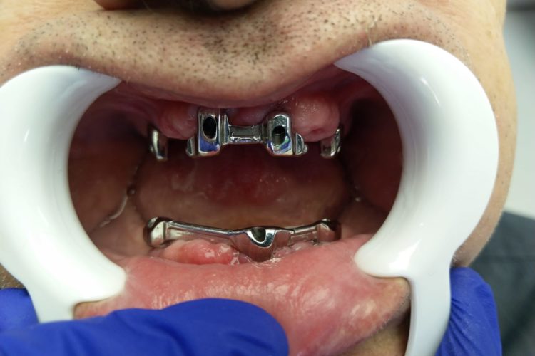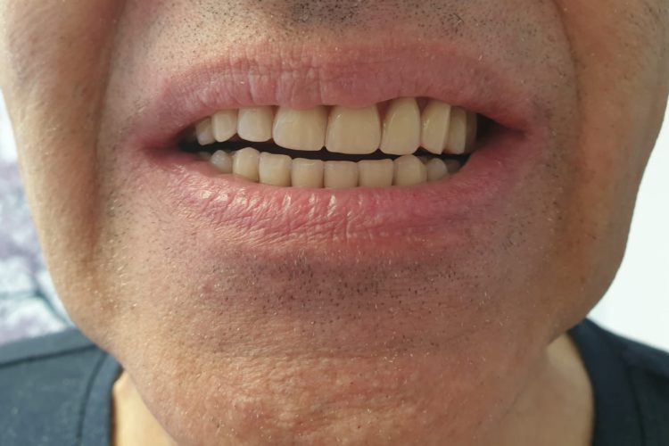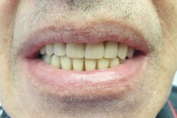 Pacient in varsta de 68 ani, a pierdut dintii complet la ambele maxilare. Se prezinta in clinica si solicita proteze functionale fixe. Pentru refacerea arcadelor prin solutii implanto-protetice s-au inserat un numar mic de implante (4 implante superior si 3 inferior) care au fost folosite la constructia unei infrastructuri a protezelor, cu bara intre implante. Supraprotezele inserate pe bara satisfac estetica si functionalitatea ca o lucrare dentara fixa.