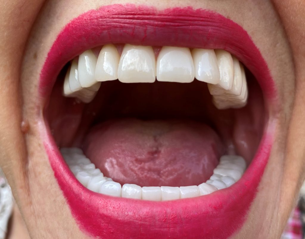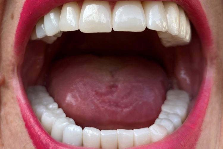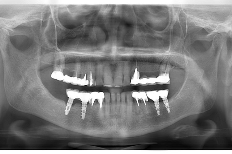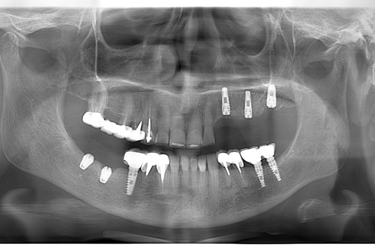 Pacienta in varsta de 74 ani s-a prezentat in clinica pentru reabilitare orala complexa si estetica. Planul de tratament a inclus implanturi Dentium, lucrari insurubate pe implanturi, fatete si coroane din hibrid